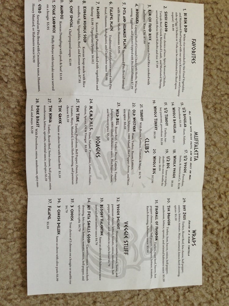 Lettuce, tomatoes, onions, bell peppers, mushroom, jalapenos, cucumber sauce, parmesean, swiss cheese, and hummus inside pocket pita bread.